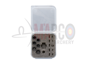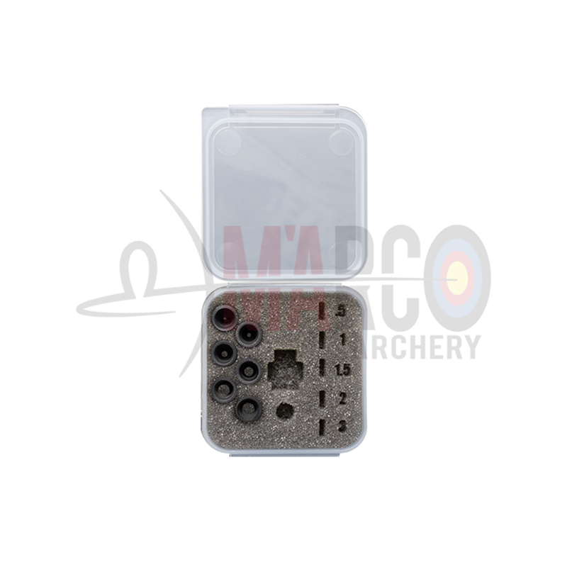 Serie completa degli inserti per peep Podium. La scatolina, che è predisposta per ospitare anche il corpo peep , paraluce e lenti, contiene la serie di 6 diversi inserti: 5/32", 1/8", 3/32", 1/16", 3/64" e 1/32".