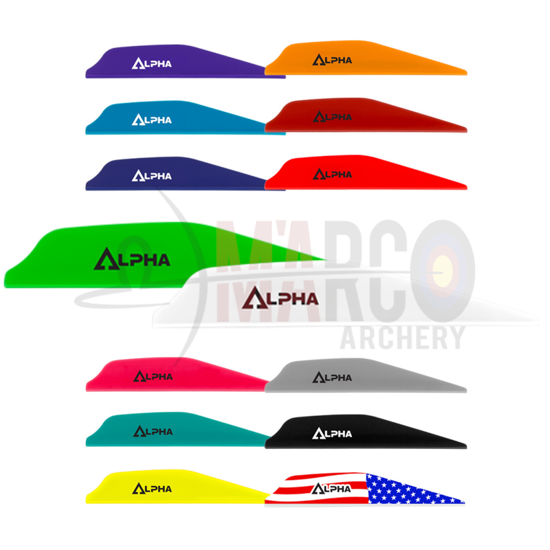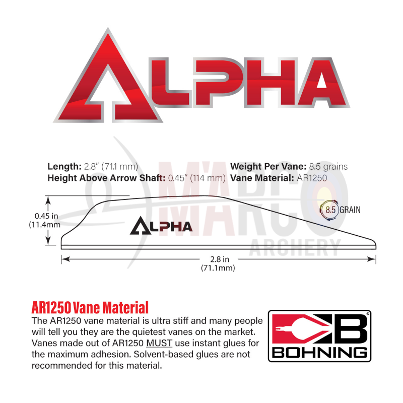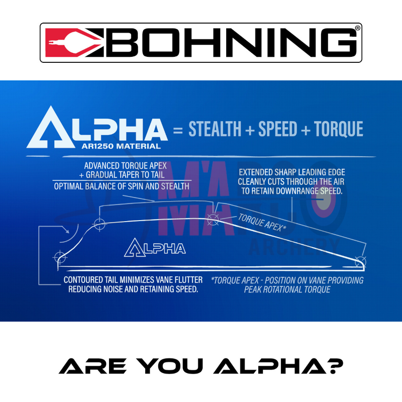 L'aletta Alpha® è un nuovo profilo per Bohning che combina Stealth+Velocità+Coppia. L'aletta presenta un apice Advanced Torque con una rastremazione graduale verso la coda, che offre un equilibrio ottimale tra rotazione e stealth. Nella parte posteriore dell'aletta, è presente una coda sagomata che riduce al minimo lo sfarfallio dell'aletta. Un minore sfarfallio riduce il rumore e aiuta a mantenere la velocità. L'aletta misura 2,8" (71,1 mm) di lunghezza, 0,45" (11,4 mm) di altezza per una bassa altezza libera dal suolo e ogni aletta pesa 8,5 grani. L'aletta Alpha eccelle come aletta 3D, aletta da caccia, aletta da tiro indoor e aletta da balestra.