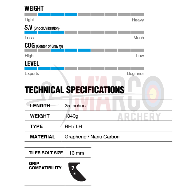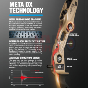 Il riser Meta DX è realizzato in carbonio grafene, la versione migliore di carbonio di Wiawis. L'utilizzo di questo materiale migliora la resistenza agli shock causati dal tiro e quindi riduce al minimo i movimenti non necessari, con conseguente miglioramento del raggruppamento delle frecce.